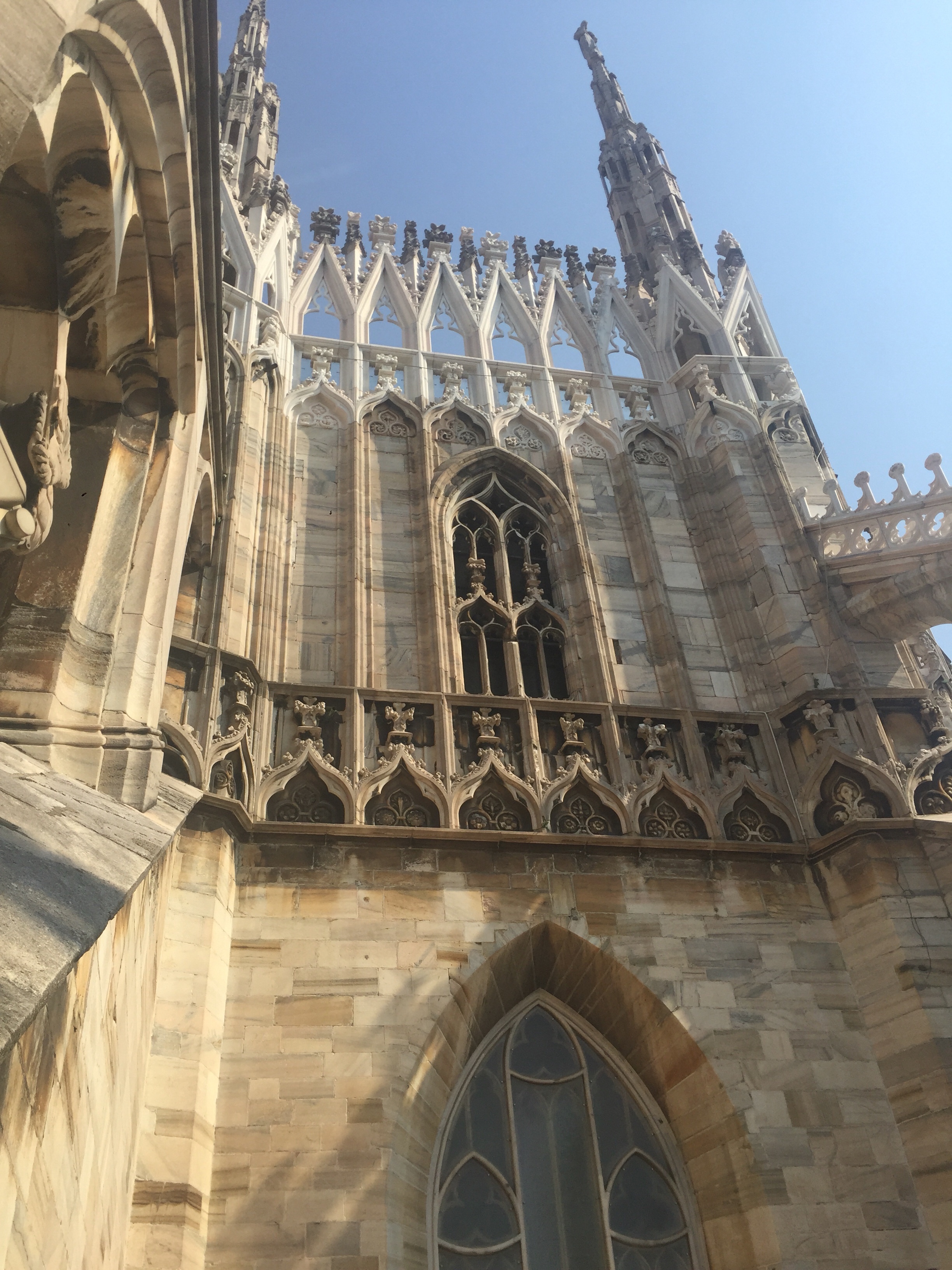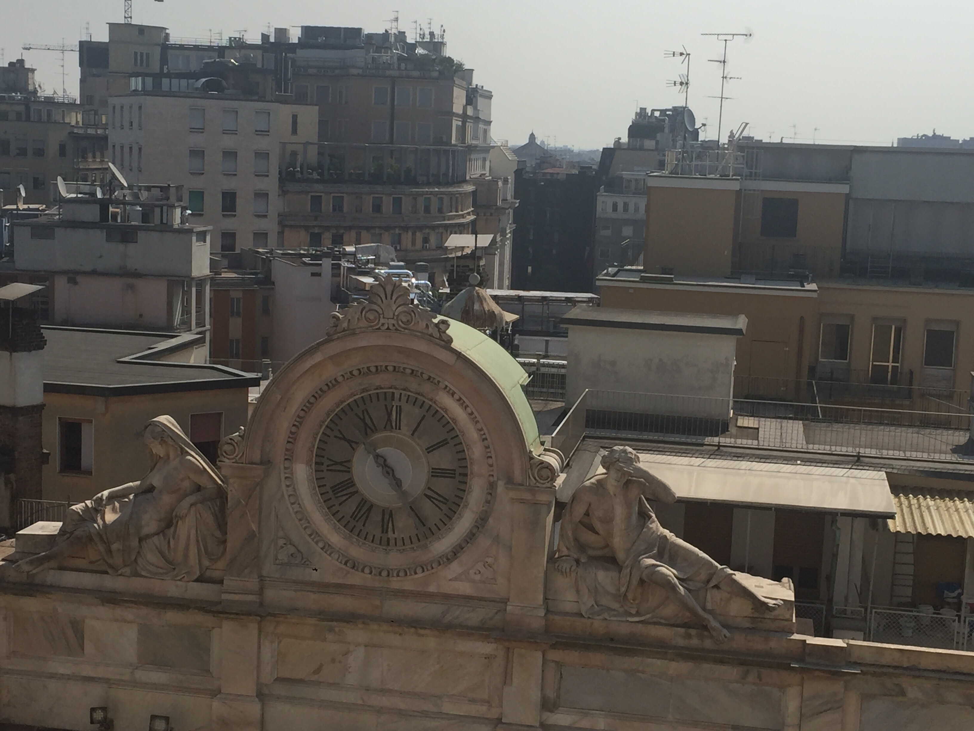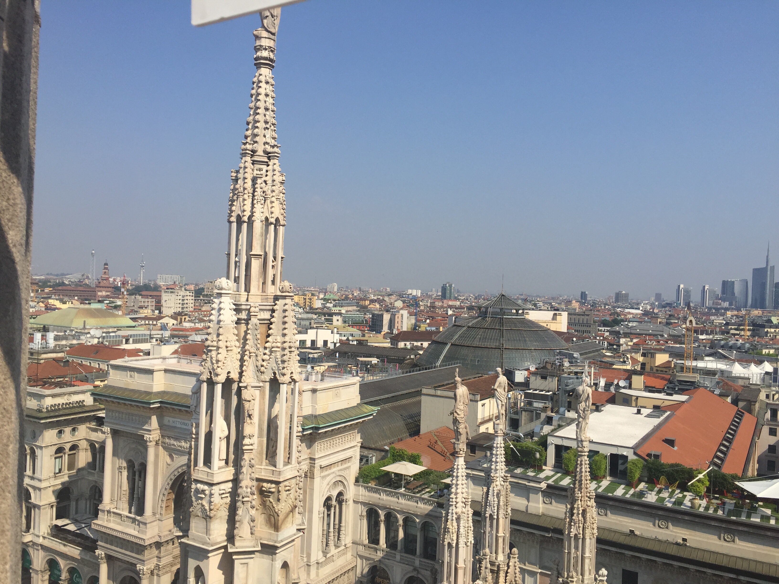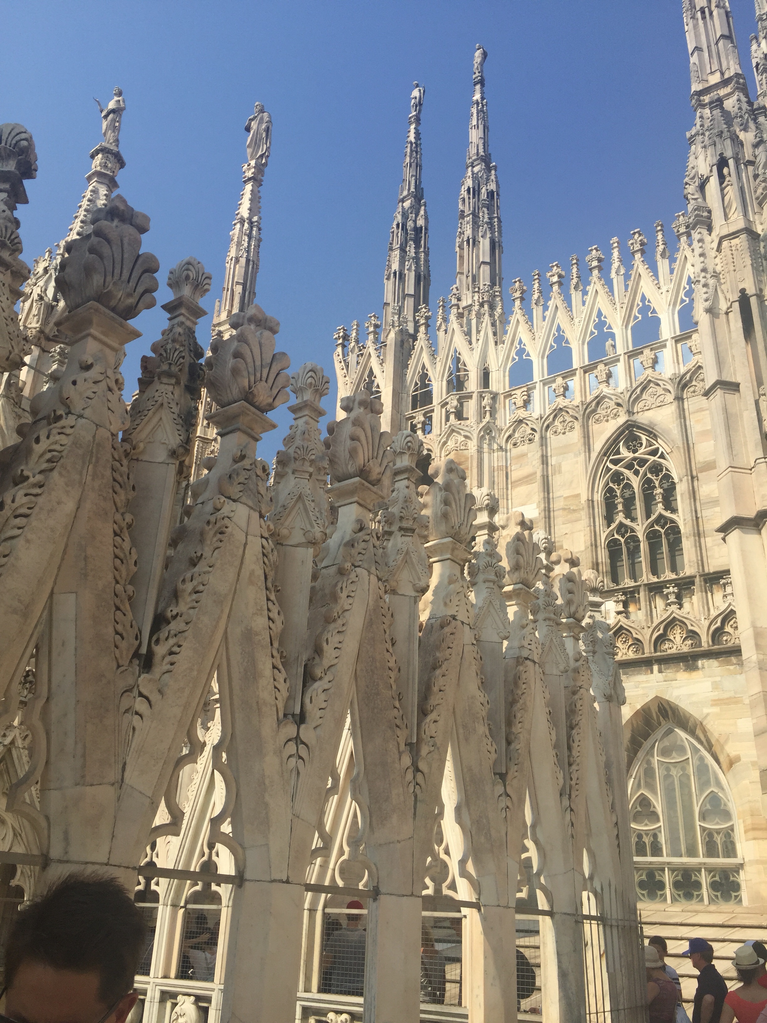 Well what a turn around after our great night with Aurora “cooking and dining” today was a day off taking in the splendours of this city (and they have them in bucket loads). Using our 24 hour metro ticket from last night which was 4.50 (euro) we had access to all forms of public transport. We caught the train to Piazza Del Duomo where there were a number of wonderful places to visit. On arrival we decided to pay for a slightly more expensive ticket called a “fast track” yep just like Disneyland. Paying extra immediately provided benefits as whilst others wilted under the harsh Milano sun we were almost immediately catching a lift to the roof top of the Duomo Cathedral. It is amazing when get to the top and realise that all of the city roads run from the Duomo or circle it. It is yet another cathedral that you could believe that gargoyles come alive at night to wreck havoc on those below. The first Milano cathedral was amazingly completed in 355, then in the 1380’s the then Archbishop arranged for the construction of the new Basilica as the original cathedral was damaged in a fire in 1075. It is particularly fascinating as you are able to go below the cathedral to the archeological dig and see the preserved parts from the 355 build.