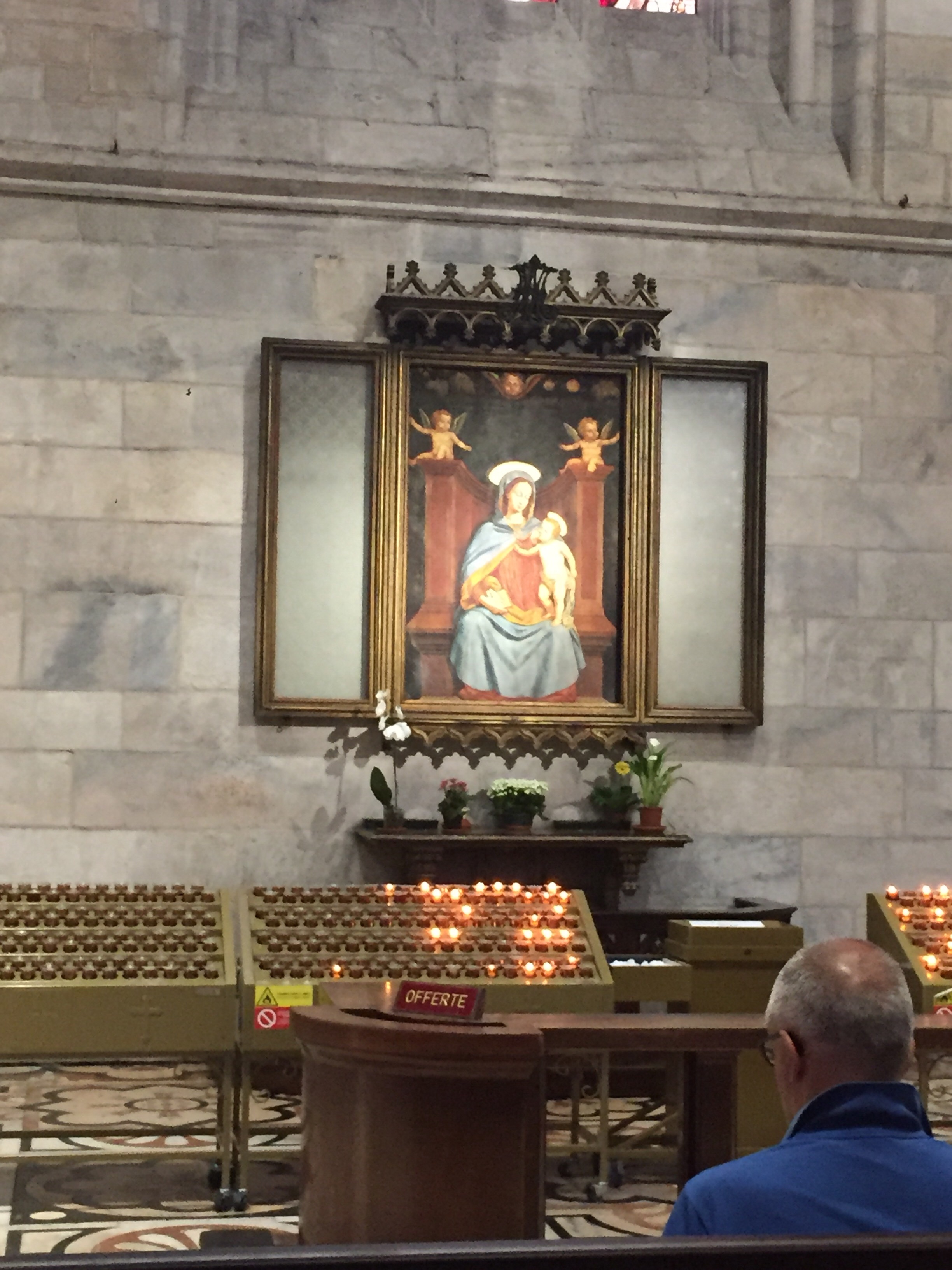 Well what a turn around after our great night with Aurora “cooking and dining” today was a day off taking in the splendours of this city (and they have them in bucket loads). Using our 24 hour metro ticket from last night which was 4.50 (euro) we had access to all forms of public transport. We caught the train to Piazza Del Duomo where there were a number of wonderful places to visit. On arrival we decided to pay for a slightly more expensive ticket called a “fast track” yep just like Disneyland. Paying extra immediately provided benefits as whilst others wilted under the harsh Milano sun we were almost immediately catching a lift to the roof top of the Duomo Cathedral. It is amazing when get to the top and realise that all of the city roads run from the Duomo or circle it. It is yet another cathedral that you could believe that gargoyles come alive at night to wreck havoc on those below. The first Milano cathedral was amazingly completed in 355, then in the 1380’s the then Archbishop arranged for the construction of the new Basilica as the original cathedral was damaged in a fire in 1075. It is particularly fascinating as you are able to go below the cathedral to the archeological dig and see the preserved parts from the 355 build.
