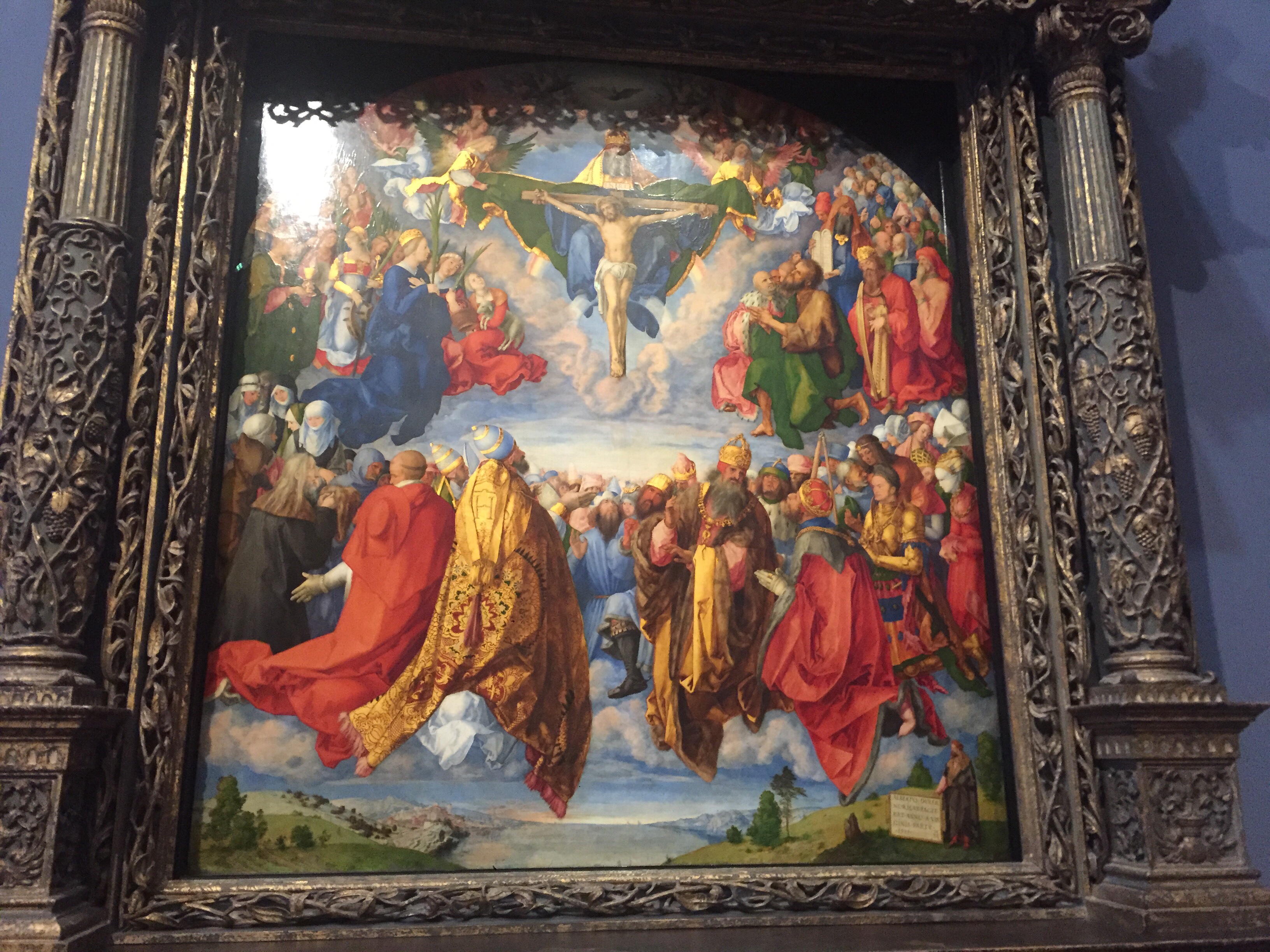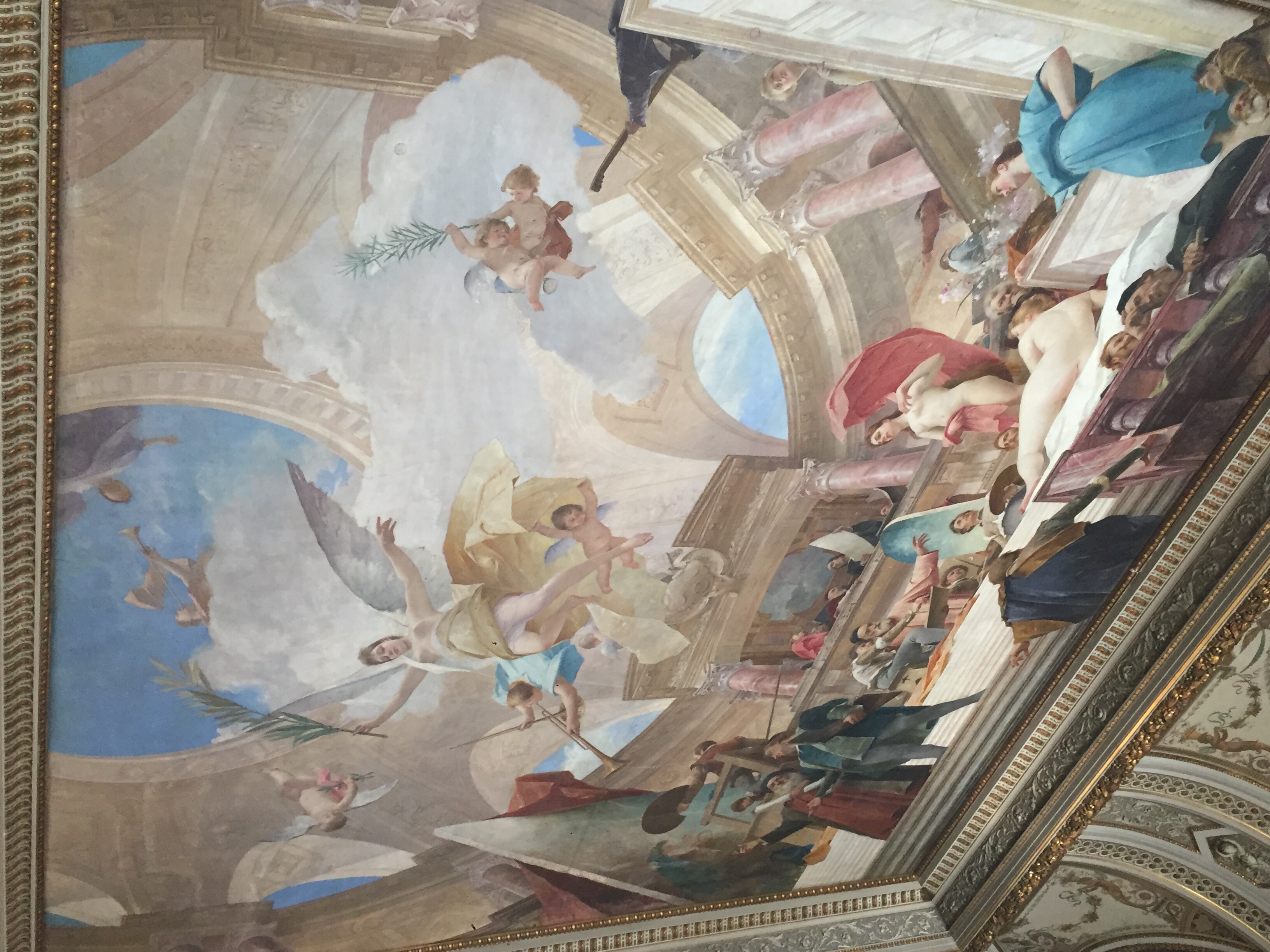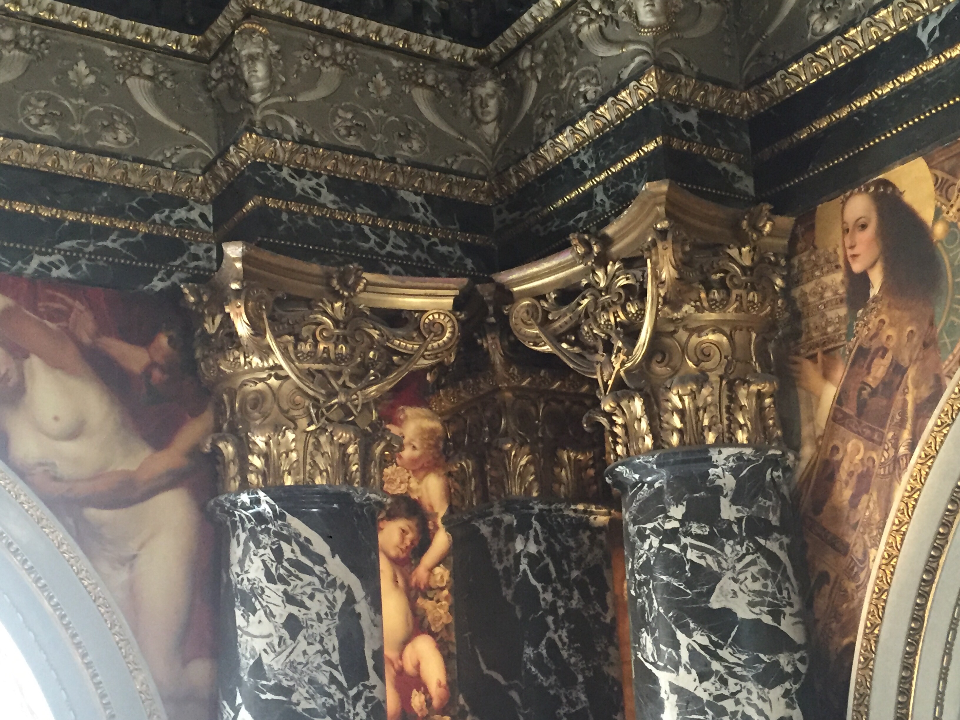 After a late lunch I spent the afternoon at the Kunsthistorisches Museum. The Museum was built in 1871 by Emperor Franz Joseph the first to be a museum, which was at the time pretty unusual. I was in seventh heaven. To mark the centenary of Gustave Klimt’s death in 1918 they have erected internal scaffolding that allows you to take a closer look at his paintings that are part of the main staircase. Theses paintings were not all Gustav Klimts work, as this was a collaborative piece with his brother Ernst and a friend of these Franz Matsch also contributing magic. I unfortunately didn’t have Steve’s great camera for these photos just my phone so I hope that they translate okay.