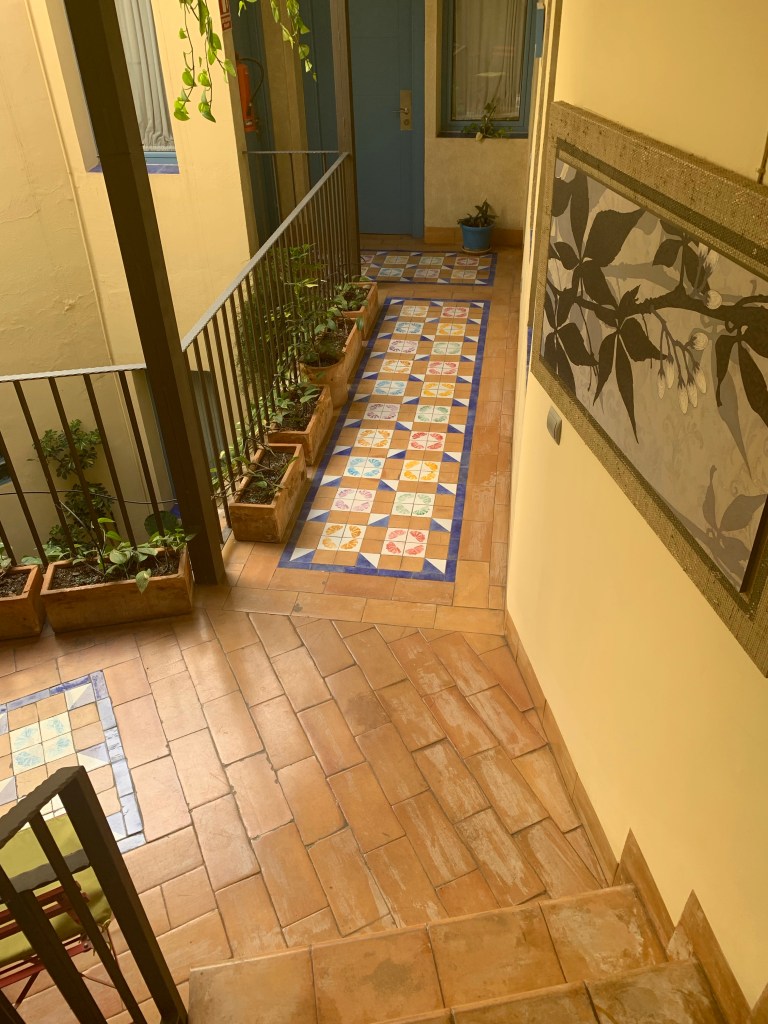 We are staying in a lovely little place called Hotel Conde de Cardenas we have a room on the second floor and there aren’t any lifts and so Steve might have a slightly different viewpoint as he was in charge of the suitcases. It is clean, comfortable and we had a little terrace off our room which was nice. The building that the hotel is in is a national heritage site and I’m not surprised as it had a Riad feeling about it.