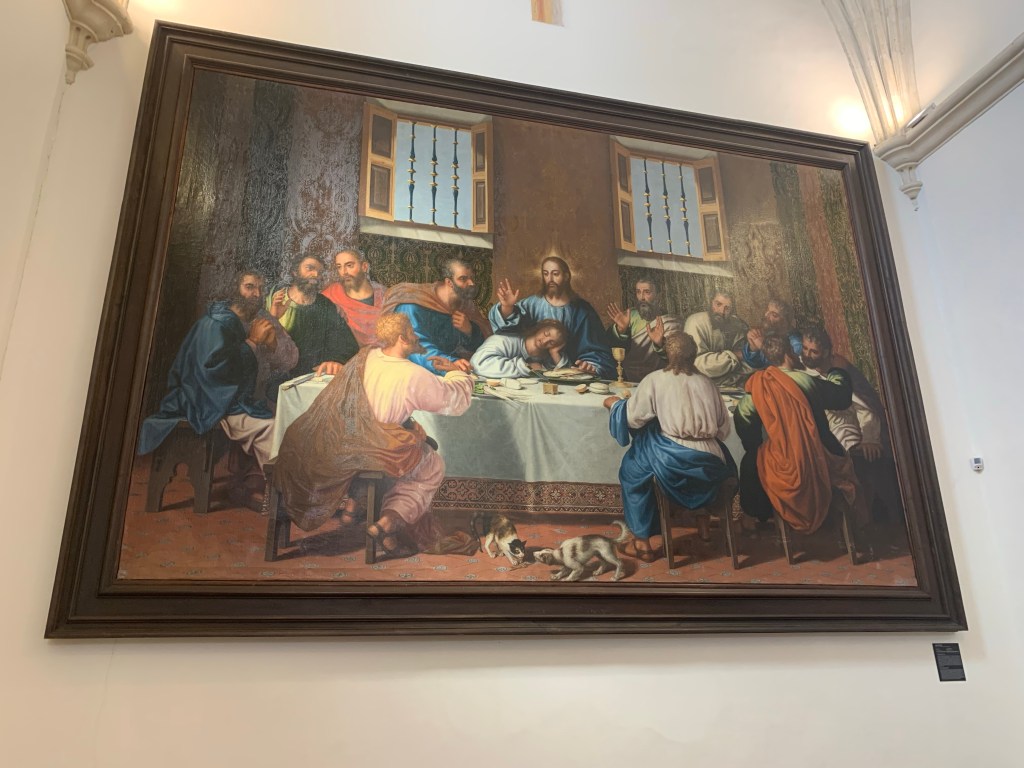 Many of the paintings in this beautiful Monasterio were created by Fray Juan Sanchez Cotan (1560 – 1627). Fray Cotan was already a renowned artist when he entered as a monk in 1603. As you stand in front of this at painting that takes up nearly a whole wall you notice that the flooring in the painting is the same as the refectory, as are the colours of the walls in this room, extraordinary. He has also added a dog and cat fighting for a scrap of fish connecting he reality of the painting to this refectory.