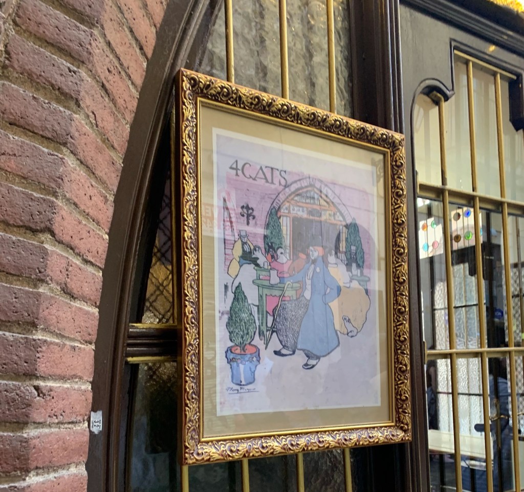 The second surprise was this little cafe Eli Quatre Gats (The four cats) which first opened its doors on 12 June 1897. Pere Romeu, with the help of some friends who financially supported him, designed Eli Quatre Gats drawing his inspiration from a French cafe he worked in Le Chat Noir. By 1899 the cafe/ piano bar was frequented by modernist and bohemian artists of the time (including his three mates who had helped finance the cafe) and a 17 year old artist by the name of Pablo Picasso. Picasso’s first solo exhibition was held here and the poster above was designed by Picasso.