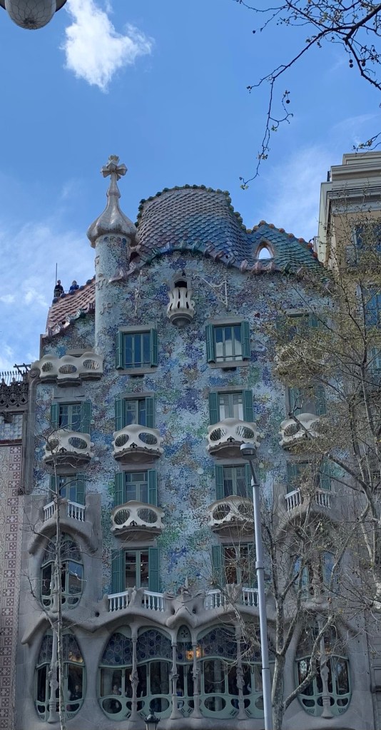 From here Tyler herded us onto the Metro and we made our way to Casa Batllocode. You may recognise the Casa it is considered one of Antoni Gaudi masterpieces. Designed in 1904 it is also known as the house of masks (the balconies are shaped like masks) or the house of dragon (the roof has scales that look like a dragons). It is so sparkly the photo doesn’t do it justice. You are able to go for a tour inside and apparently it is pretty impressive.