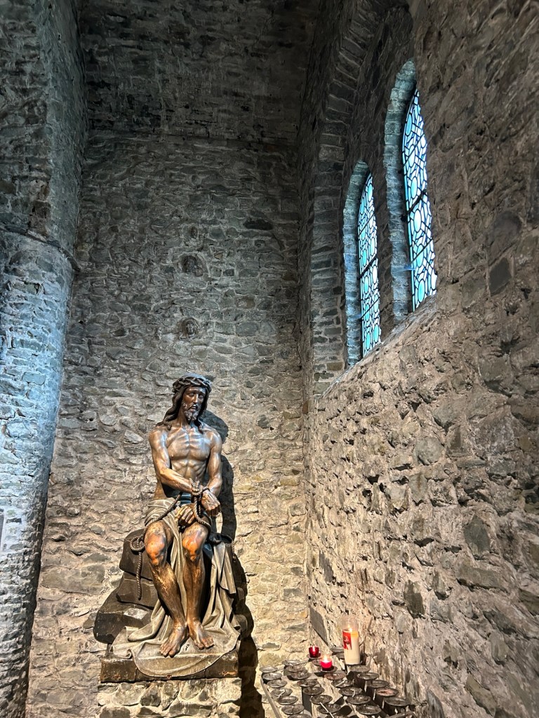 The “Derniere Cene” was designed in 2004 by Fabienne Havaux and sits almost in the Church foyer. It really jumped out to me and was definitely my favourite piece in this Church. It portrays Christ right in the centre of the picture on the night he was betrayed. He is surrounded by the twelve apostles. Only Christ is recognisable. All of the other faces are nameless but are the apostles. It is a powerful and unique piece, I was really moved by it.