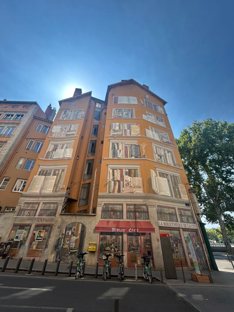 Painted in 1998, this fabulous mural is located over the river from Old Town at 6 Rue de la Platiere. It features 300 books with each book spine referencing famous authors, philosophers and figures connected to Lyon. I know it’s pretty cool!